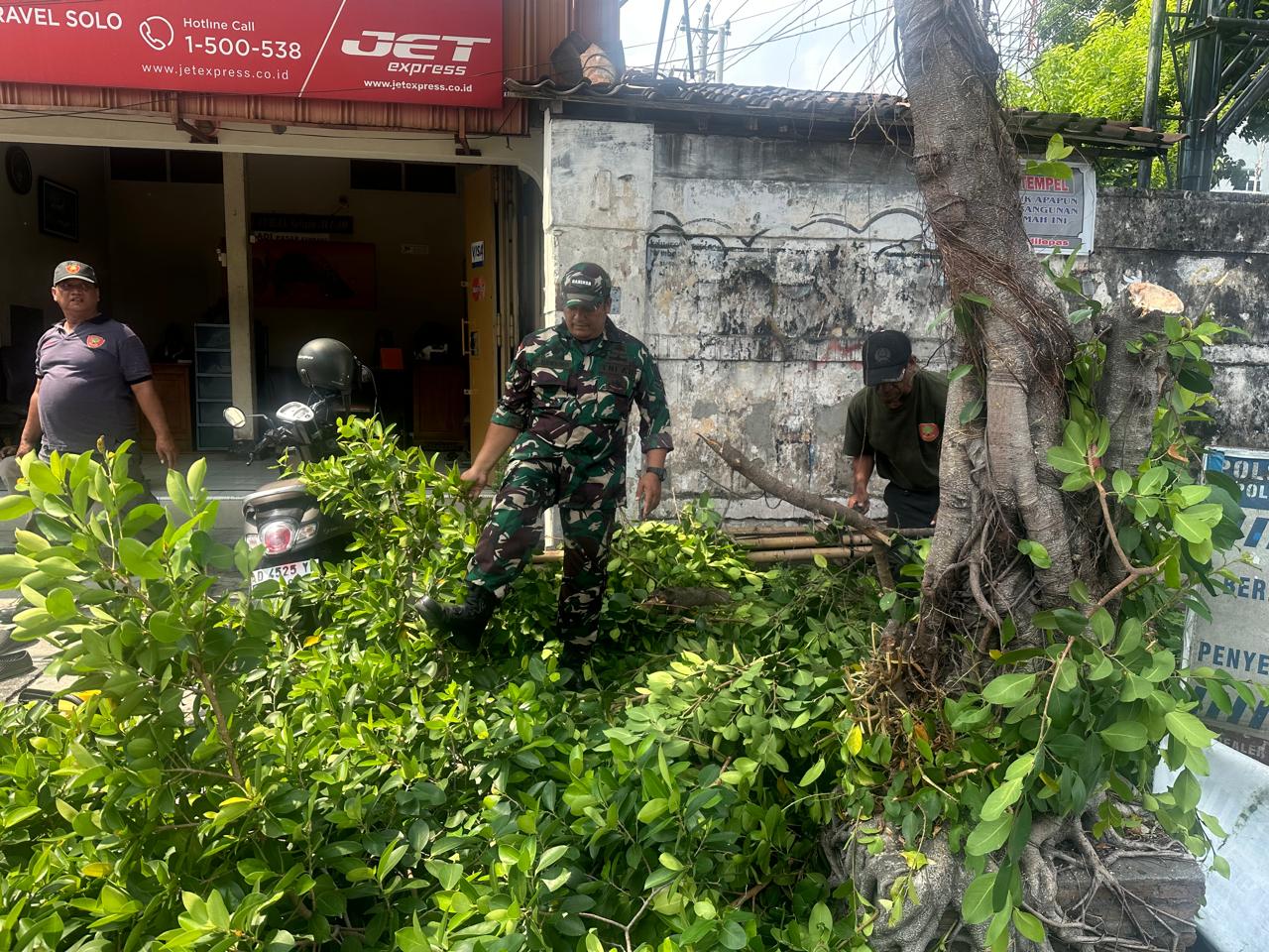 Babinsa Kelurahan Kemlayan Koramil 03 Serengan Kodim 0735 Surakarta Serda Catur Handoko bersama Linmas dan petugas kebersihan serta warga melaksanakan kerja bakti pemangkasan ranting pohon yang menghalangi jaringan listrik serta membahayakan bagi pengguna jalan tersebut, (28/12/2024)