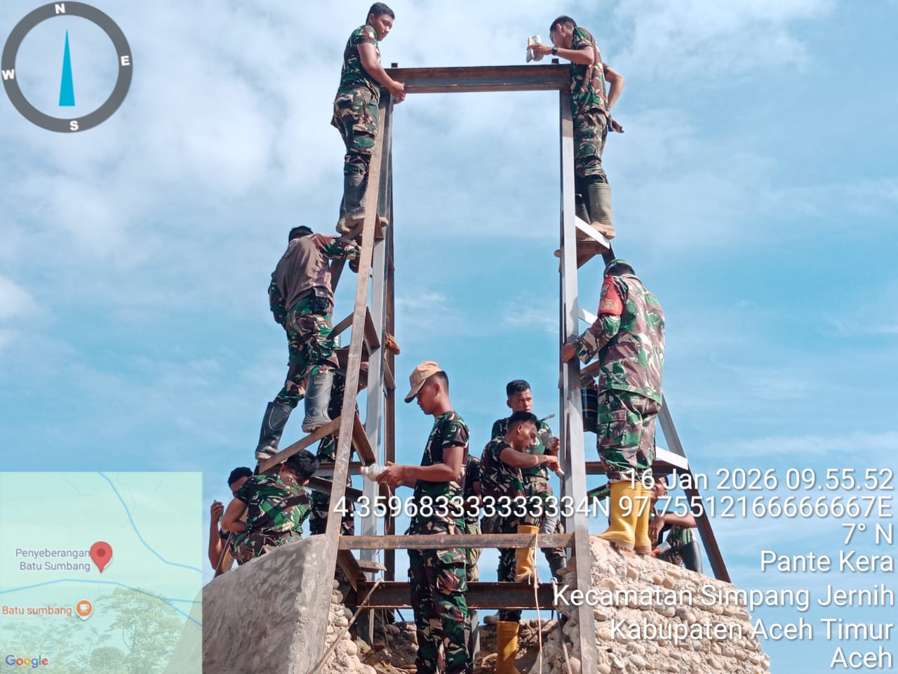 Kodim 0104/Aceh Timur melalui Babinsa Koramil 10/Simpang Jernih Serda Supriadi bersama personel Yon TP 853/BRB melaksanakan kegiatan pengecatan menara Deadmen “A” Jembatan Gantung yang berada di Desa Batu Sumbang, Kecamatan Simpang Jernih, Kabupaten Aceh Timur, Jumat (16/1/2026).