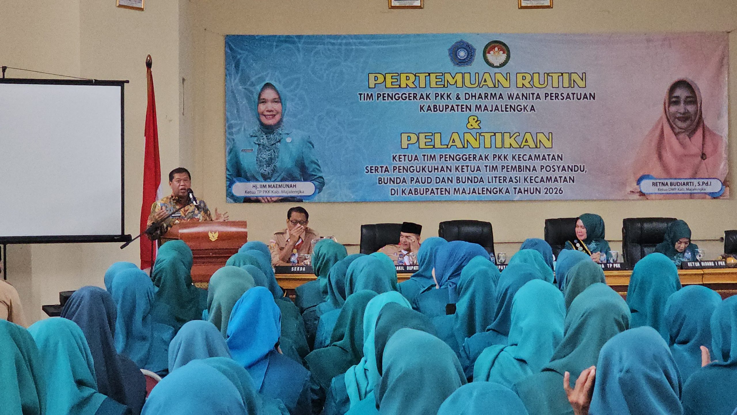 Bupati Majalengka, H. Eman Suherman menghadiri kegiatan pelantikan Ketua Tim Penggerak PKK Kecamatan, Bunda PAUD Kecamatan, Bunda Literasi serta Ketua Tim Pembina Posyandu Kecamatan se-Kabupaten Majalengka yang digelar di Gedung Nyi Rambut Kasih, Rabu (14/1/2026).