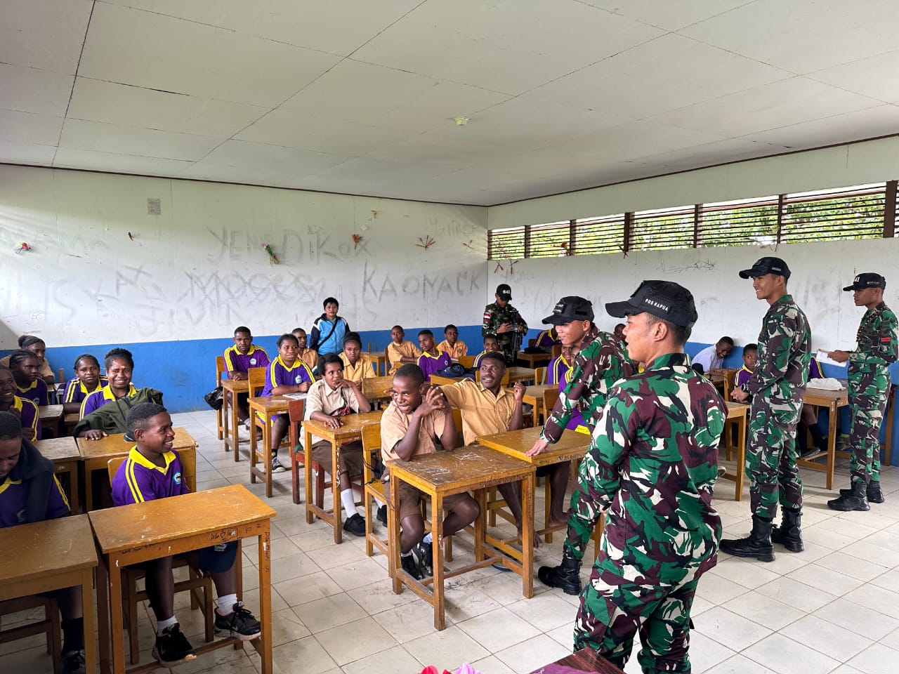 Pos Napua Satgas Yonif 641/Bru menunjukkan kepedulian terhadap anak-anak sekolah yang berada di Distrik Wamena, melalui Tim Tenaga pendidik Pos Napua membantu mengajar siswa-siswa SMP YPPGI ANIGOU, Kampung Hurekama, Distrik Wamena, Kabupaten Jayawijaya, Propinsi Papua Pegunungan, (29/01/2025).