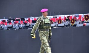 Dengan langkah tegap dan meyakinkan, Komandan Pasmar 1 (Danpasmar 1) Mayjen TNI (Mar) Ili Dasili, S.E., memimpin langkah defile Kontingen TNI AL pada Geladi Upacara peringatan Hari Ulang Tahun (HUT) Ke-80 TNI yang digelar di Lapangan Silang Monas, Jakarta Pusat, Rabu (01/10/2025).