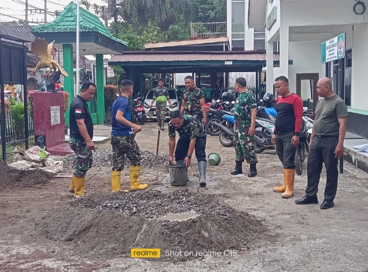 Komandan Koramil (Danramil) 418-01/Makrayu Kapten Inf Edi Gunawan bersama anggota Babinsa melaksanakan kegiatan pengecoran halaman Makoramil sebagai bagian dari upaya pembenahan sarana dan prasarana satuan.