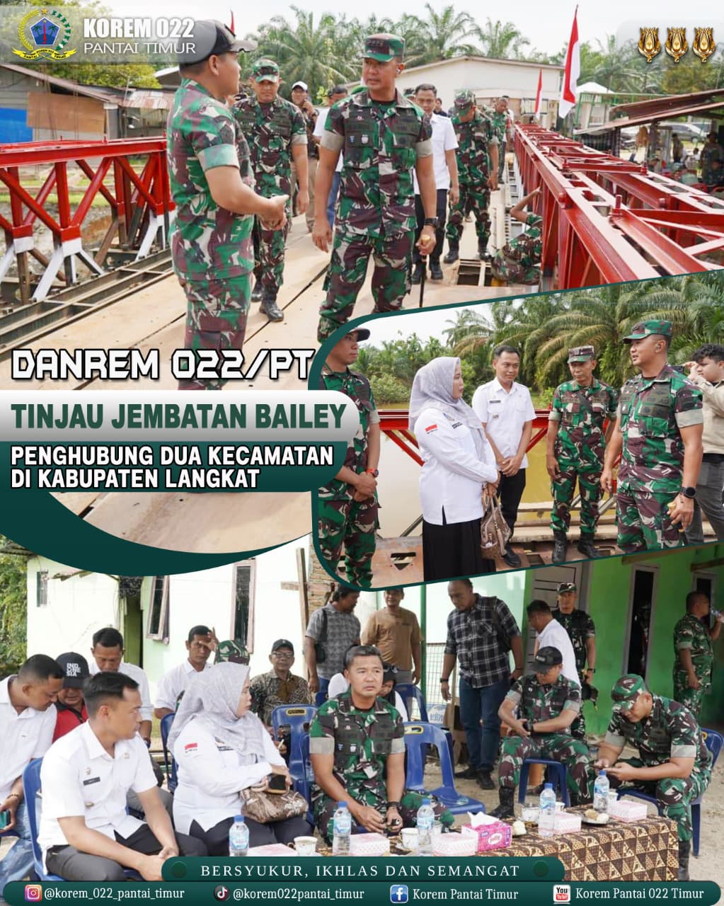 Komandan Korem 022/Pantai Timur, Kolonel Inf Sandi Kamidianto, S.I.P., M.I.P., didampingi Dandim 0203/Langkat serta Kepala Seksi Teritorial Korem 022/PT, melaksanakan peninjauan Jembatan Bailey yang menghubungkan Desa Besilam Bukit Lembasa, Kecamatan Wampu, dengan Desa Banjaran Raya, Kecamatan Padang Tualang, Kabupaten Langkat, Rabu (21/01/2026).