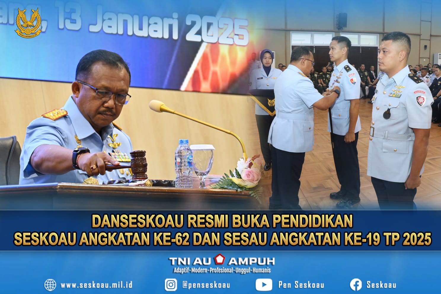 Komandan Sekolah Staf dan Komando TNI Angkatan Udara (Danseskoau), Marsda TNI I Made Susila A., S.I.P., S.H., M.Hum., secara resmi membuka Pendidikan Sekolah Staf dan Komando Angkatan Udara (Seskoau) Angkatan Ke-62 dan Sekolah Staf Angkatan Udara (Sesau) Angkatan Ke-19 Tahun Pelajaran (TP) 2025. Acara pembukaan berlangsung di Gedung Grha Dirgantara Seskoau, Lembang, Bandung Barat, pada Senin (13/1/2025).