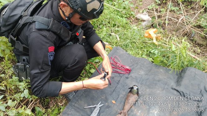 Detasemen Gegana Satbrimob Polda Jawa Barat melalui Unit Penjinak Bom (Jibom) melaksanakan kegiatan Bantuan Kendali Operasi (BKO) kepada Polres Garut dalam rangka pengamanan dan penanganan temuan amunisi bom militer. Selasa (27/01/2026)