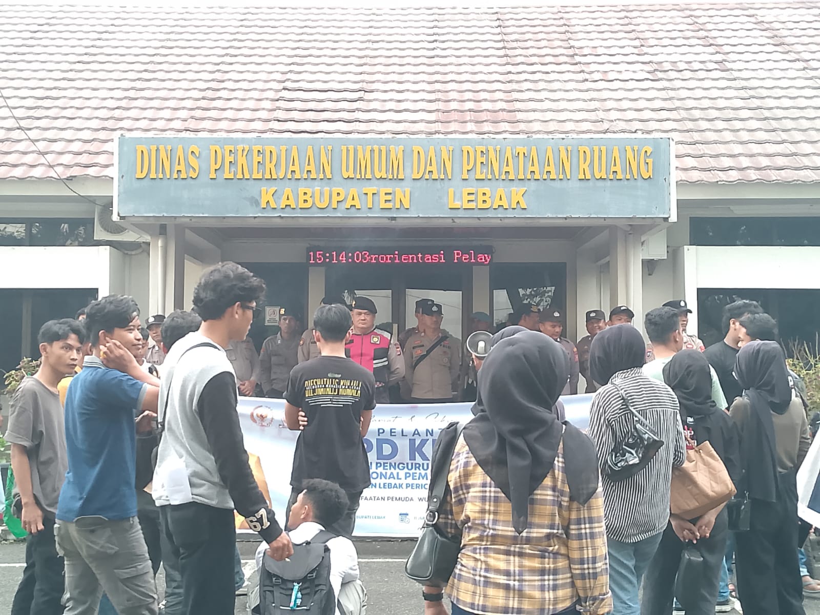 Aksi unjuk rasa yang digelar puluhan aktivis dari Keluarga Mahasiswa Lebak (Kumala) di depan Kantor Dinas Pekerjaan Umum dan Penataan Ruang (DPUPR) Kabupaten Lebak, Senin (30/6/2025).