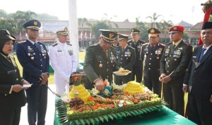 Sebagai wujud rasa syukur atas pengabdian panjang TNI kepada bangsa, rangkaian kegiatan dilanjutkan dengan prosesi pemotongan tumpeng oleh Kasrem 064/MY, didampingi Danlanal Banten dan Danlanud Gorda.
