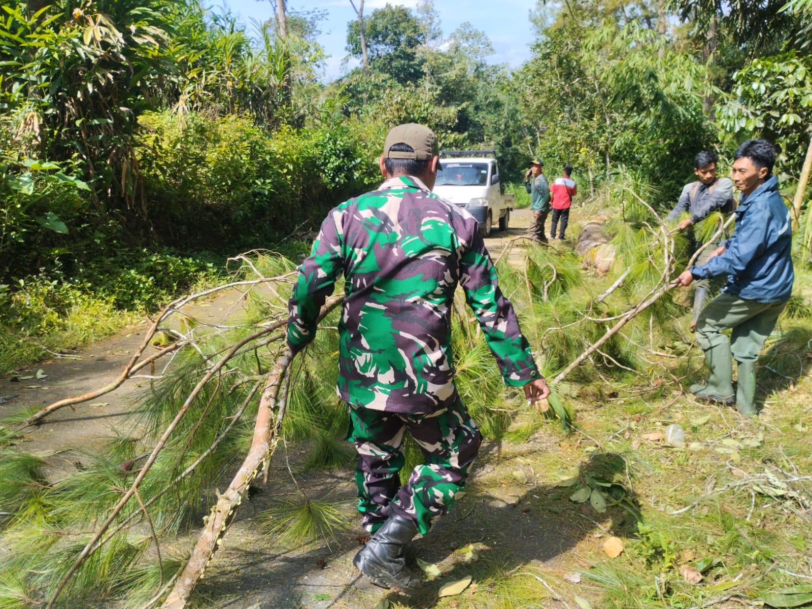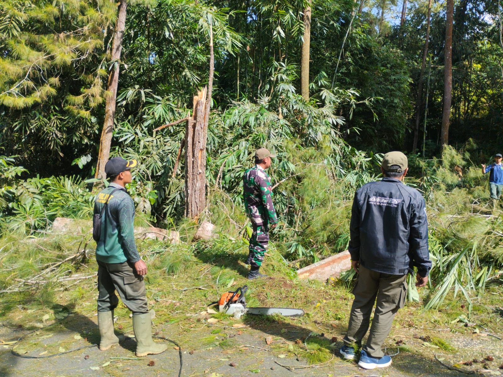 Dengan menggunakan gergaji mesin, Koptu Adi bersama tim berjibaku memotong batang dan ranting pohon pinus yang menutup badan jalan. Proses pembersihan dilakukan secara cepat namun tetap memperhatikan aspek keamanan, mengingat adanya kabel yang ikut tertimpa.