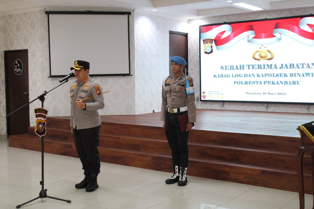 Pekanbaru – Kapolresta Pekanbaru, Kombes Pol Jeki Rahmat Mustika, S.I.K., memimpin upacara serah terima jabatan (Sertijab) Kabag Log dan Kapolsek Bina Widya Polresta Pekanbaru. Kegiatan ini berlangsung pada Senin, 10 Maret 2025, pukul 08.15 WIB di Aula Zapin Polresta Pekanbaru.