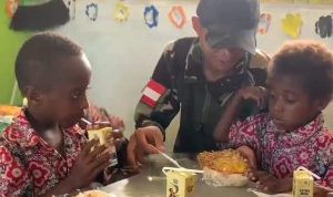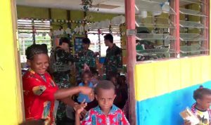 Pembinaan teritorial terus dilakukan oleh Satgas Pamtas Kewilayahan RI-PNG Yonif 642/Kps, melalui Pos Jagiro. Pembagian makan gratis untuk siswa siswi TK medario kampung Jagiro, Distrik. Moskona Selatan Kabupaten Teluk Bintuni Provinsi Papua Barat. (5/7).