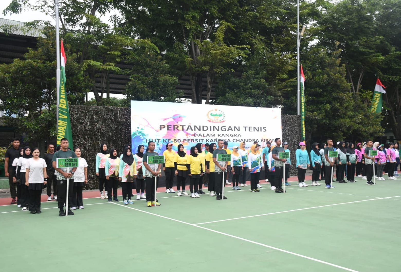 Ketua Persit Kartika Chandra Kirana (KCK) Daerah V/Brawijaya Ibu Vira Rudy Saladin membuka kejuaraan tenis dalam rangka memperingati HUT ke-80 Persit KCK yang digelar di Lapangan Tenis Brawijaya, Surabaya, Selasa (27/1/2026).