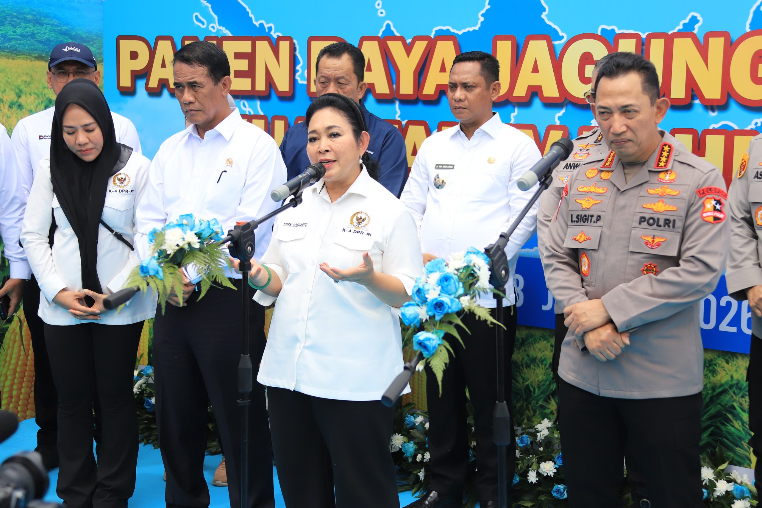 Panen raya dalam rangka mendukung program swasembada pangan nasional ini dihadiri Kapolri Jenderal Polisi Listyo Sigit Prabowo, Menteri Pertanian Andi Amran Sulaiman dan Ketua Komisi IV DPR RI Siti Hediati Haryadi atau Titiek Soeharto.