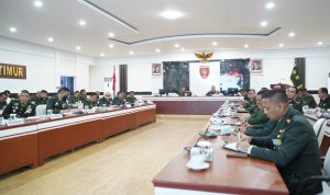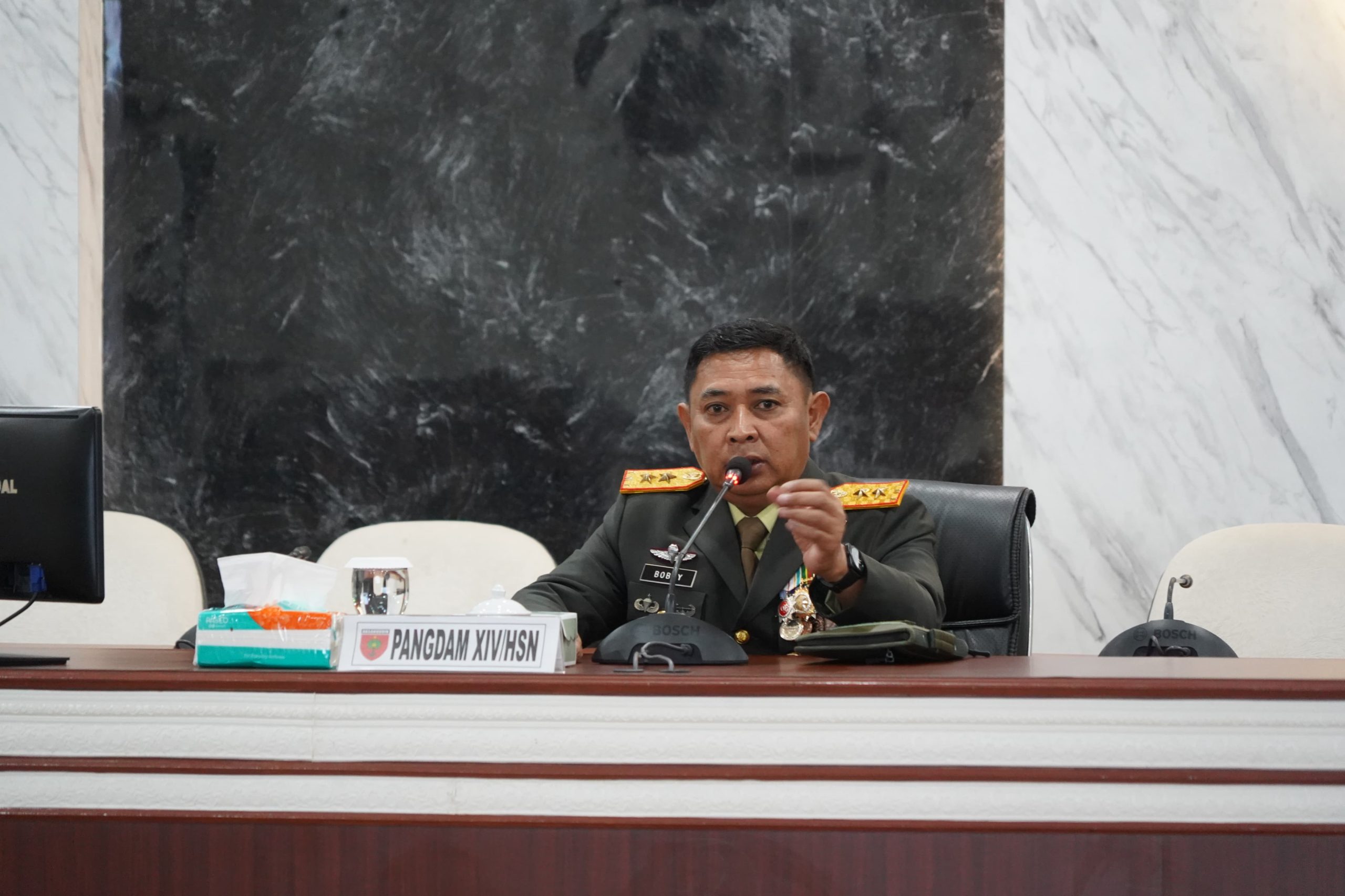 Pangdam XIV/Hasanuddin, Mayjen TNI Bobby Rinal Makmun, S.I.P, memberikan pengarahan kepada seluruh Pejabat Utama (PJU) Kodam, Kepala Badan Pelaksana Kodam (Kabalakdam) dan para Komandan Satuan (Dansat) jajaran Kodam XIV/Hasanuddin, baik secara offline maupun virtual, terpusat di Ruang Bina Yudha Makodam Jl. Urip Sumoharjo Kota Makassar, Minggu, (10/11/2024)