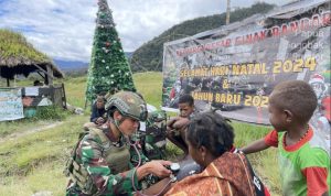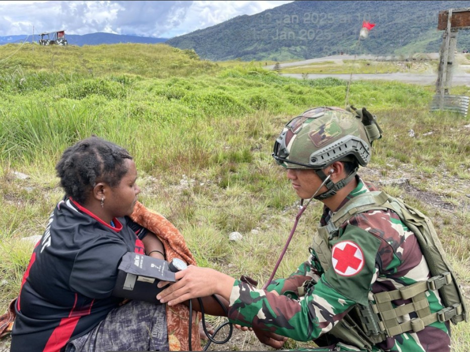 Satgas Pamtas Mobile Yonif 323/Buaya Putih Kostrad, menunjukkan kepeduliannya terhadap masyarakat Papua. Prajurit yang bertugas di titik kuat Sinak Bandara memberikan pelayanan kesehatan kepada masyarakat yang berkunjung ke Titik kuat Sinak Bandara yang dilaksanakan di Kampung Gigobak, Distrik Sinak Kab. Puncak, Papua Tengah. Senin (6/1/2025).