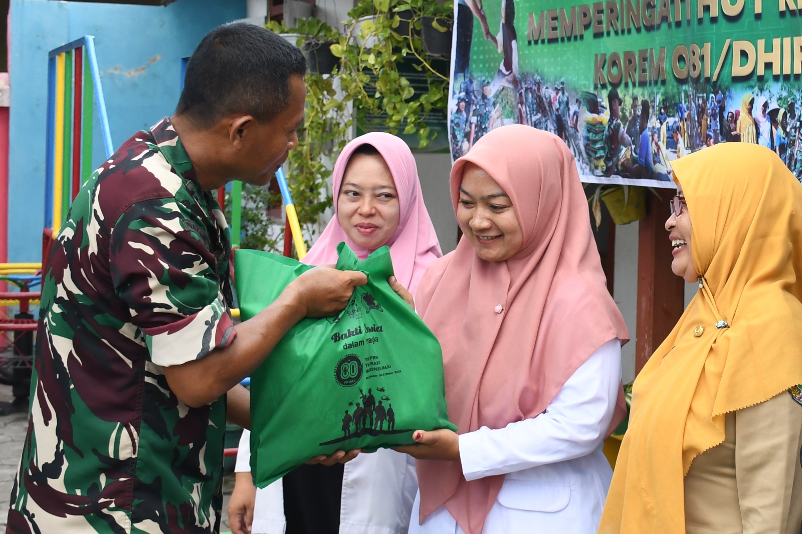 Dalam rangka memperingati HUT ke-80 Tentara Nasional Indonesia (TNI), Korem 081/DSJ memberikan bantuan kepada para guru TK Kartika IV-17 dan TK Kartika IV-15 di Kota Madiun, Senin (29/9/2025). Kegiatan ini sejalan dengan komitmen pemerintah untuk terus meningkatkan kesejahteraan para tenaga pendidik.