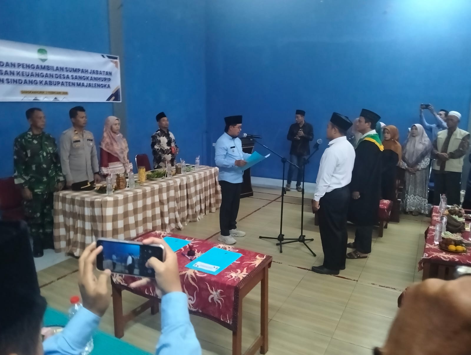 Kegiatan berlangsung khidmat di Aula Desa Sangkanhurip dan dihadiri unsur pemerintah desa serta tamu undangan.