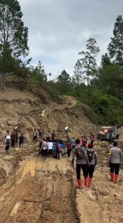 Perjalanan menuju Kecamatan Pining dihadapkan pada berbagai kendala, mulai dari jalan licin, lumpur tebal, hingga material banjir yang menutup hampir seluruh jalur. Di sejumlah titik, rombongan harus berhenti dan menunggu alat berat membuka jalan. Kapolres bersama unsur pemerintah daerah secara langsung mengawal proses pembukaan akses agar jalur dapat segera dilalui.