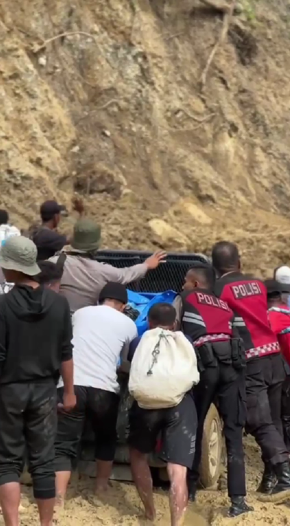 Perjalanan menuju Kecamatan Pining dihadapkan pada berbagai kendala, mulai dari jalan licin, lumpur tebal, hingga material banjir yang menutup hampir seluruh jalur. Di sejumlah titik, rombongan harus berhenti dan menunggu alat berat membuka jalan. Kapolres bersama unsur pemerintah daerah secara langsung mengawal proses pembukaan akses agar jalur dapat segera dilalui.
