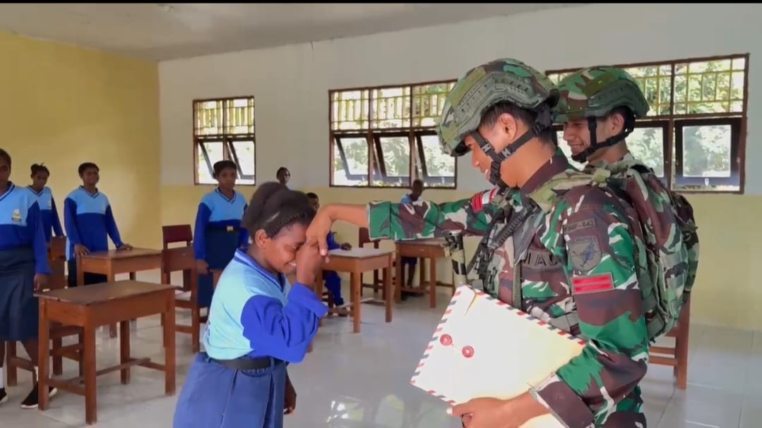 Satgas Pamtas RI-PNG Yonif 642/Kps membantu guru dalam memberikan ujian mata pelajaran Informatika kepada siswa SMPN Satap Horna Kelas VII dan VIII di Distrik Dataran Beimes, Kabupaten Teluk Bintuni, Provinsi Papua barat. (30/11/2024)