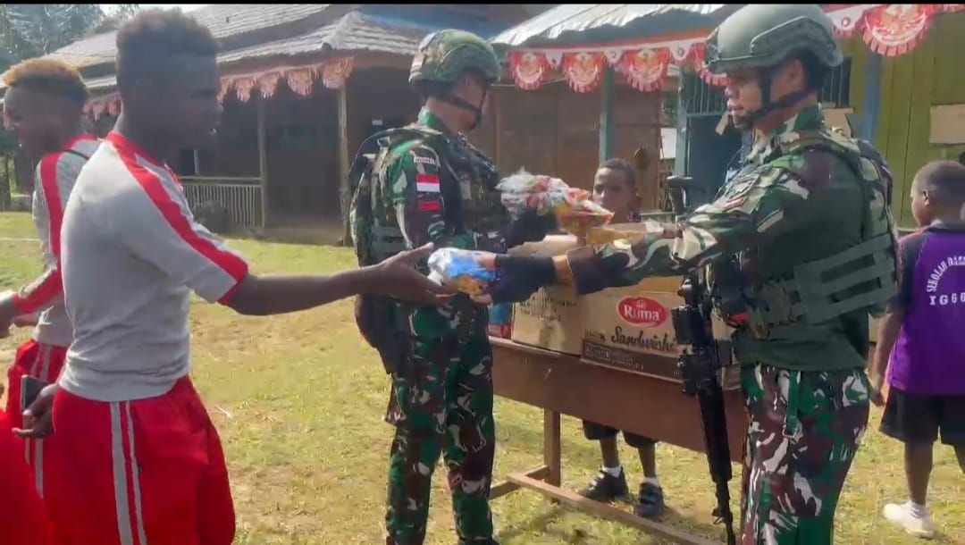 Pos Mesna Satgas Yonif 642/Kps Bagikan Jajanan Ringan Kepada Anak-Anak Papua