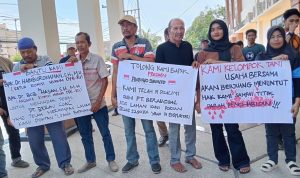 Sementara itu diluar ruangan sidang tampak perwakilan warga Poktan UBM membentangkan berbagai tulisan diatas kanvas yang bertuliskan diantaranya “Kami Kelompok Tani Usaha Bersama Akan Berjuang Menuntut Hak Kami Sampai Titik Darah Penghabisan..!!!