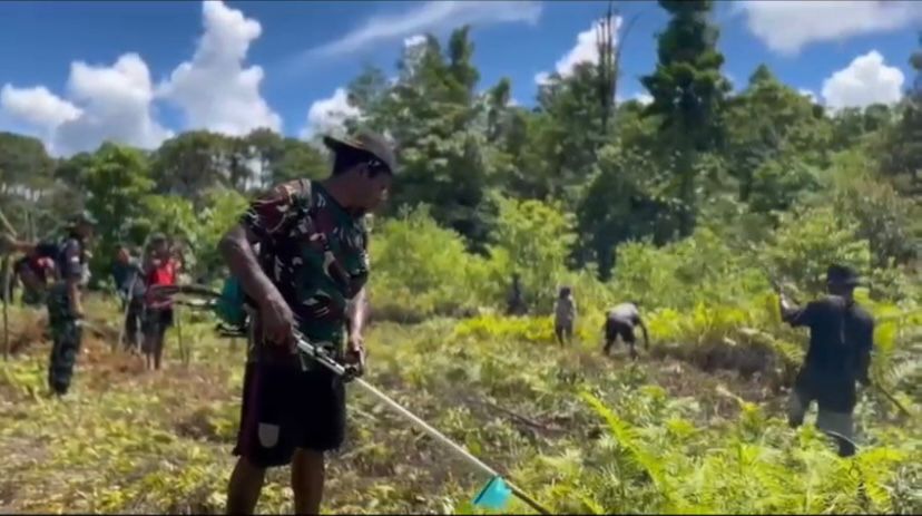 Bentuk aplikasi kegiatan teritorial dengan masyarakat sekitar, Satgas Pamtas RI-PNG Kewilayahan Yonif 763/SBA Pos Afkrem membantu masyarakat membersihkan jalanan di sekitar Kampung Afkrem. (3 Oktober 2025).
