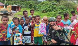 Dikarenakan sekolah sedang dalam situasi libur skhir semester, Anggota Pos Satgas Pamtas Kewilayahan Papua Barat Yonif 642/Kapuas, mengumpulkan anak anak yang berada di Distrik Dataran Beimes guna mempermudah dalam proses pembagian.