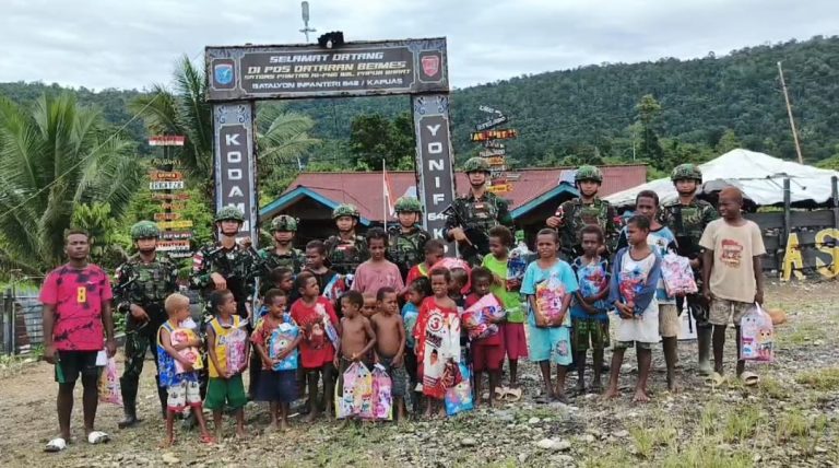 Kegiatan berbagi alat tulis satgas pamtas kewilayahan RI-PNG wilayah Papua Barat kepada anak-anak sekolah di Distrik Dataran Beimes, Kabupaten Teluk Bintuni, Provinsi Papua Barat. (30/12/2024).