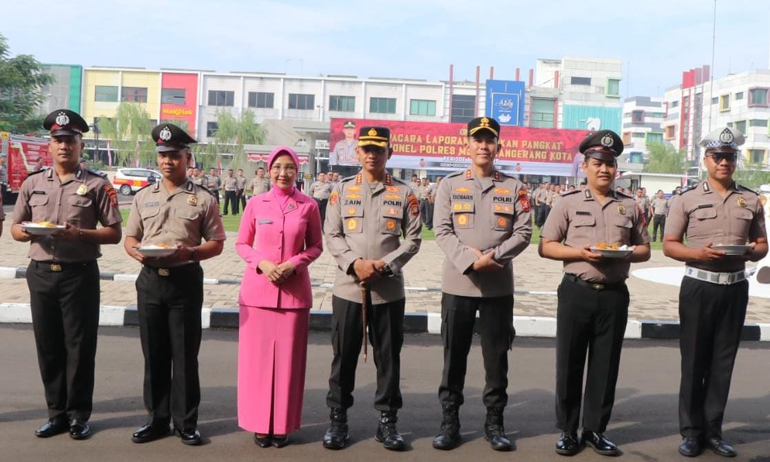 Kapolres Metro Tangerang Kota, Kombes Pol Zain Dwi Nugroho memimpin upacara menaikkan pangkat 102 anggota satu tingkat lebih tinggi.