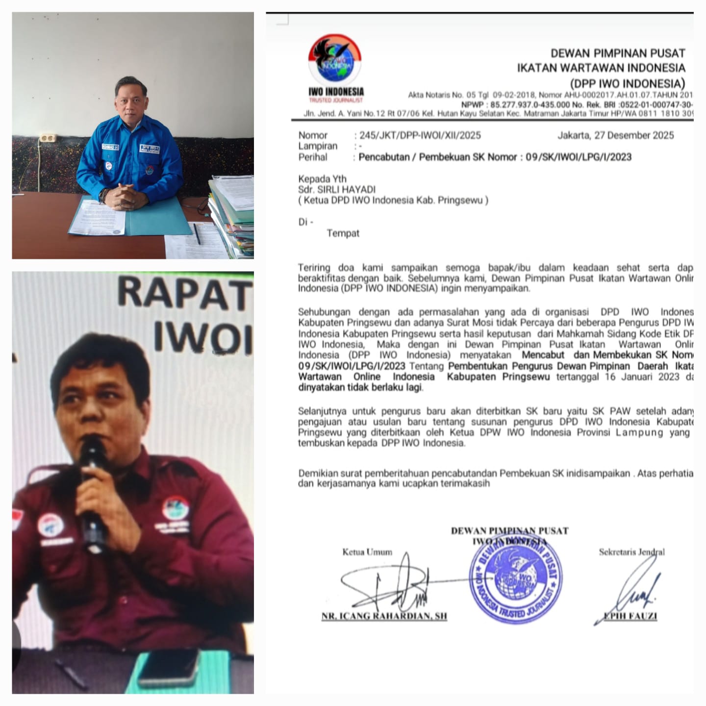 04 Januari 2026 Indonesia Jurnalis -Dewan Pimpinan Pusat Ikatan Wartawan Online Indonesia (IWO-I) resmi mengeluarkan surat pembekuan dan pencabutan Surat