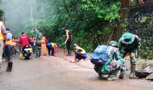 Prajurit TNI dari Koramil 0806-07/Watulimo dan anggota Polsek Watulimo ikut bekerja bersama warga, mengangkat batu, mencampur aspal dingin, menambal jalan berlubang, hingga mengatur lalu lintas.