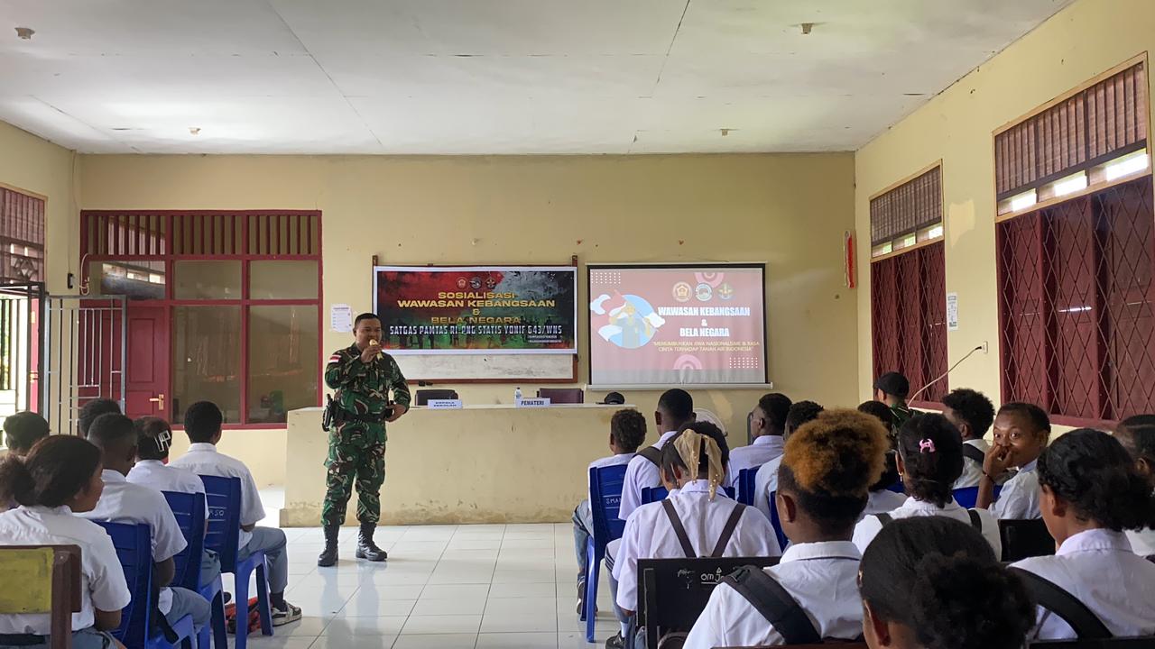 Dalam rangka menumbuhkan Jiwa Nasionalisme dan Rasa Cinta Tanah Air, Satgas Yonif 643/Wns Berikan Sosialisasi Wawasan Kebangsaan dan Bela Negara di SMA N 4 Arso, Distrik Arso, Kab. Keerom, Prov. Papua, Senin, (19/1/2026).