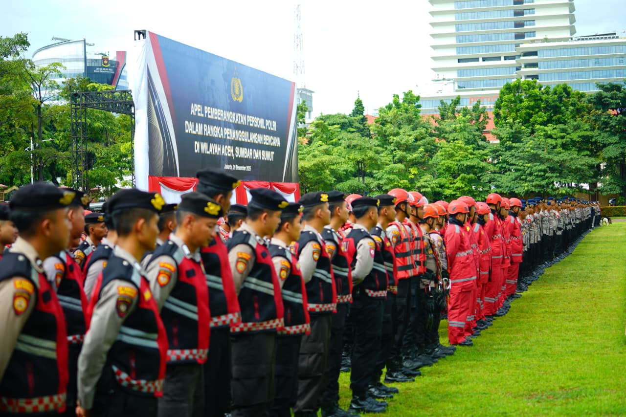 Wakapolri Komjen Pol Prof. Dr. Dedi Prasetyo menegaskan komitmen Polri untuk terus hadir di tengah masyarakat melalui apel pemberangkatan personel Polri dalam rangka penanggulangan bencana di Aceh, Sumatera Utara, dan Sumatera Barat. Apel digelar di Lapangan Bhayangkara Mabes Polri, Jumat (26/12/2025).