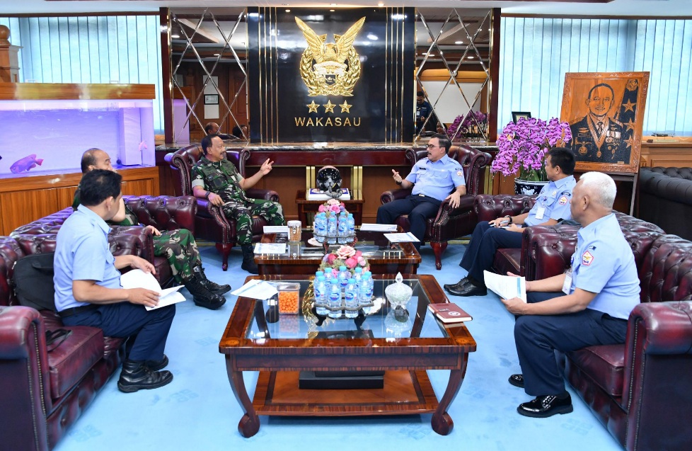 Wakil Kepala Staf Angkatan Udara (Wakasau) Marsekal Madya TNI Ir. Tedi Rizalihadi S., MM, menerima kunjungan Ketua Umum Yayasan Adi Upaya (Yasau) Marsekal Muda TNI (Purn) Jemi Trisonjaya, SM, M.Tr.(Han), MIPol., di Ruang CC Wakasau, Mabesau, Cilangkap, Jakarta Timur, Rabu (24/9/2025).