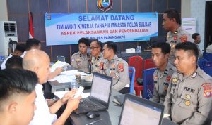 Kegiatan audit dipimpin langsung oleh Irwasda Polda Sulbar Kombes Pol. Enday Sudrajat, S.H., S.I.K., didampingi oleh Ketua Tim Kompol Jufri Hamid, S.Sos., bersama para auditor yakni Aiptu Asrul Arlin A, S.Sos., Iptu Aris Subianto, Iptu Muhklis Achmad, S.H., dan Iptu Kadriansyah, S.H., M.Si.