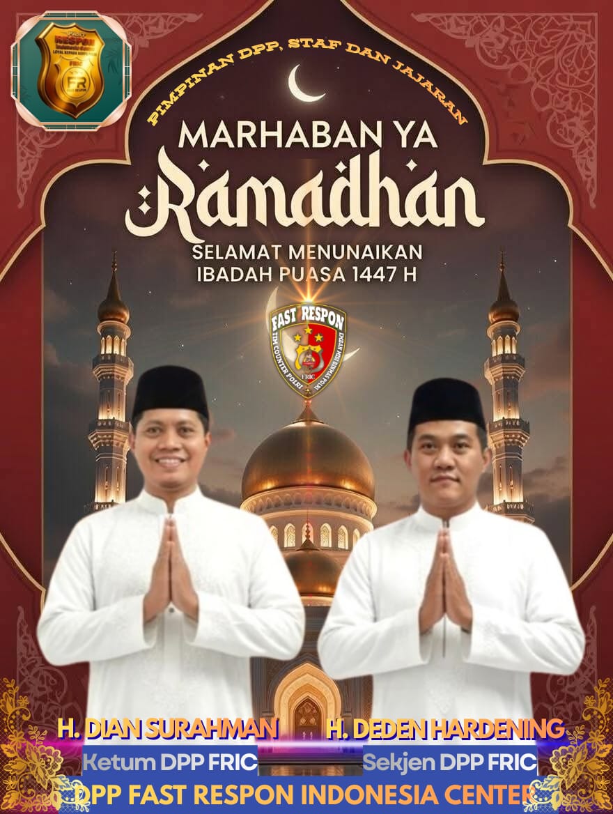 Sehubungan dengan datangnya bulan suci Ramadhan 1447 Hijriah tahun 2026 Masehi. Keluarga Besar Dewan Pimpinan Pusat (DPP) Fast Respon Indonesia Center (FRIC) dan jajaran mengucapkan selamat menjalankan ibadah Puasa Ramadhan 1447 Hijriah kepada seluruh umat Islam di Indonesia dan dunia.
