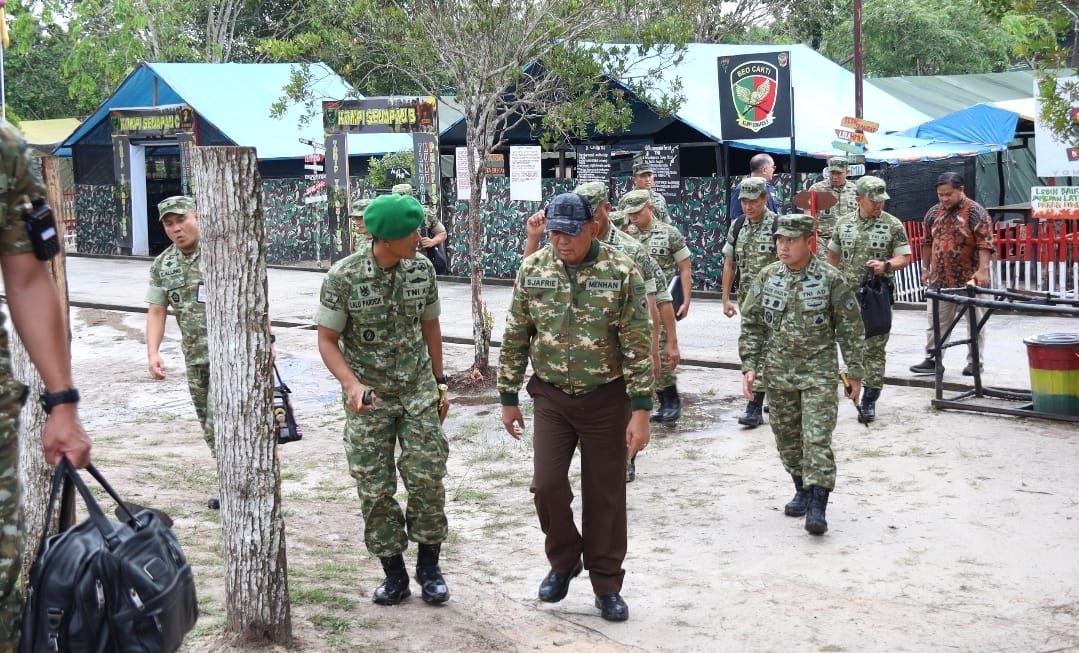 Pangdam XIX/Tuanku Tambusai Mayjen TNI Dr. Agus Hadi Waluyo, S.A.P., M.M., CHRMP., mendampingi Menteri Pertahanan Republik Indonesia Jenderal TNI (Purn) Sjafrie Sjamsoeddin dalam kunjungan kerja ke Yonif TP 851/BBC, Kabupaten Siak pada Kamis 18/12/25.