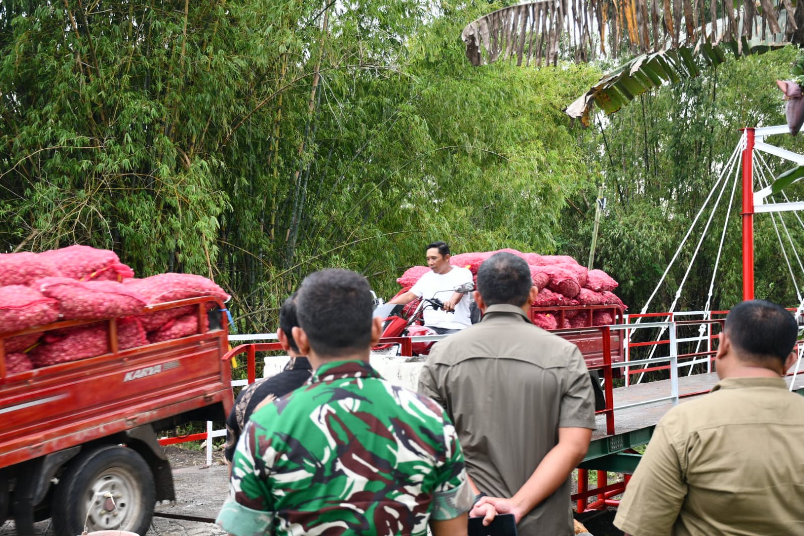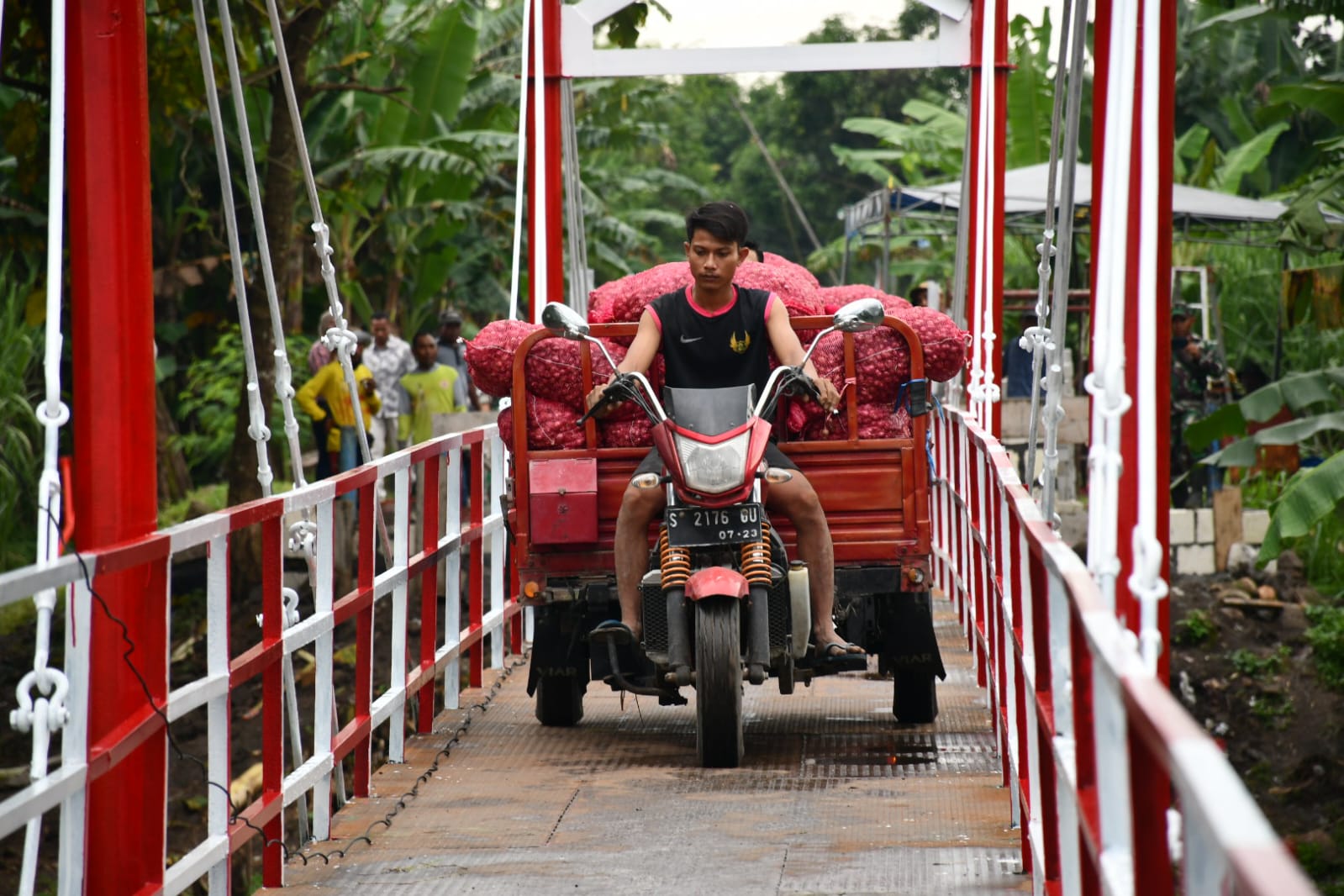 Danrem mengungkapkan bahwa jembatan kabel pancang tersebut dapat dilalui dua unit tossa secara bersamaan dengan muatan maksimal 1 ton per kendaraan. Dengan kapasitas tersebut, distribusi hasil pertanian dan kebutuhan pokok warga diharapkan menjadi lebih lancar.