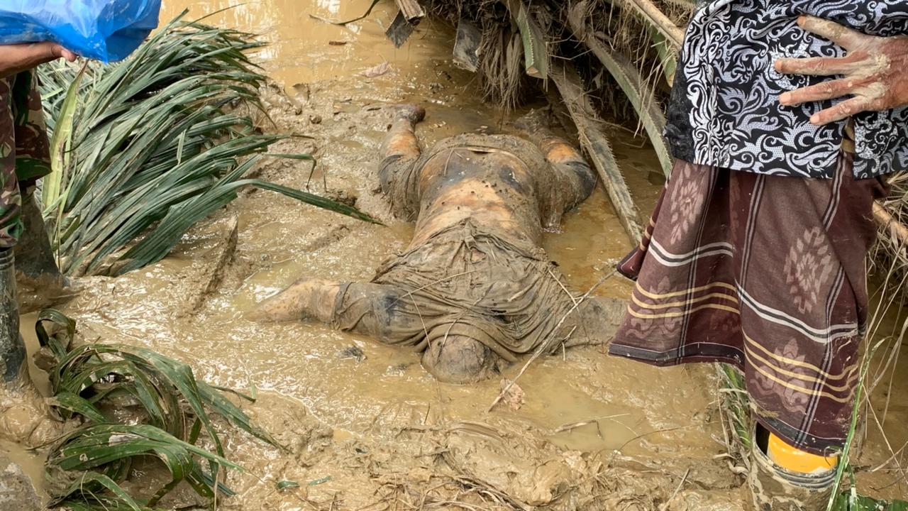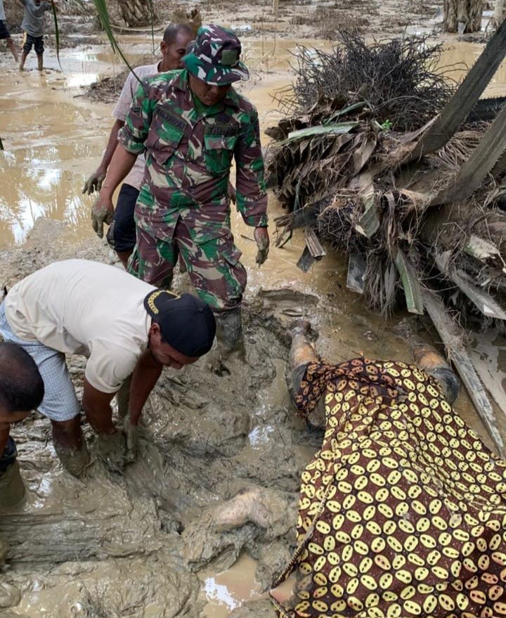 TNI Evakuasi Jenazah Korban Banjir Bandang di Ladang Sawit Warga Langkahan.